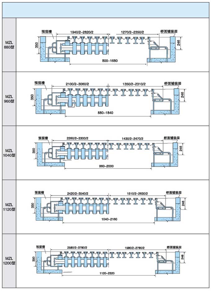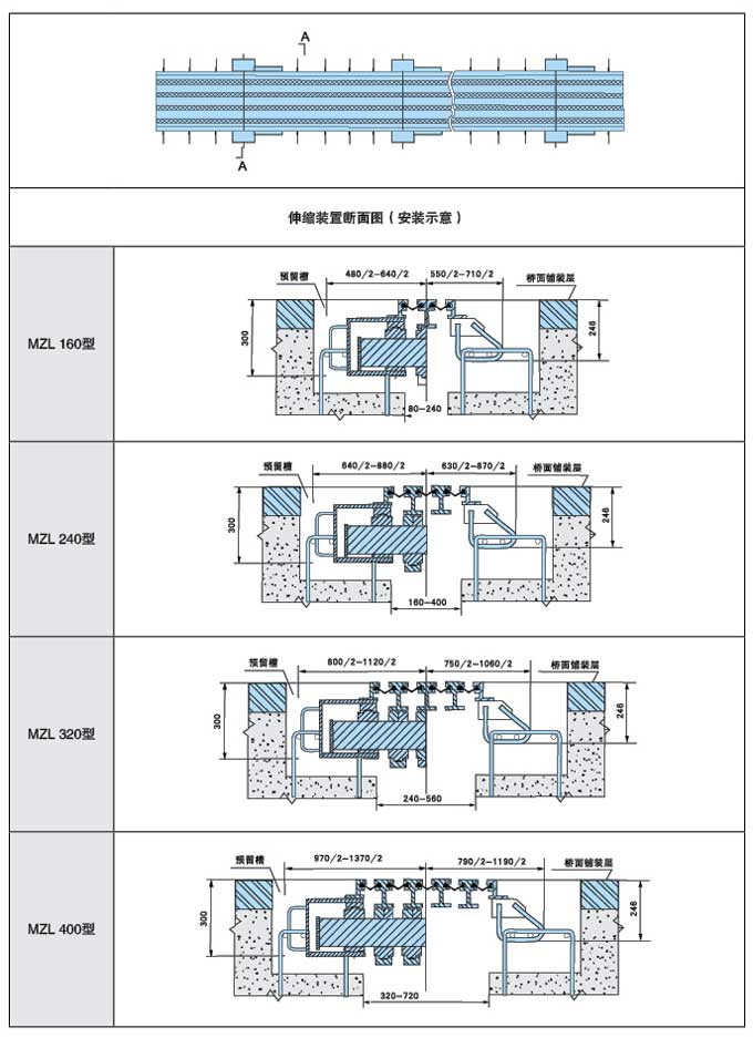 橋梁伸縮裝置各種規(guī)格總體尺寸與安裝示意圖