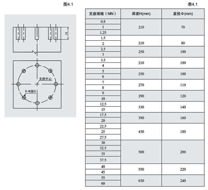 a.澆注壤臺(tái)墊石時(shí),在墊石頂面做出地腳蜾栓套筒預(yù)留孔。如圖4.1所示,預(yù)留孔深度及直徑見表4.1。
